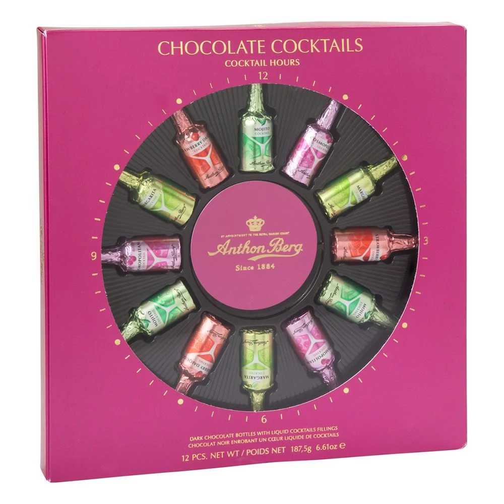 Exkluzív Anthon Berg praliné válogatás igazi likőrrel töltött bonbonokkal: klasszikus koktélok ízei – rum, konyak, whisky és pezsgő – finom ét- és tejcsokoládé héj alatt. Luxus élmény minden alkalomra.