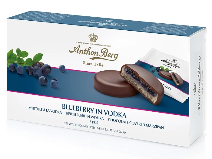 cukor, kakaómassza, áfonya (13%), mandula (11%), sárgabarackmag, glükózszirup, vodka (3%), kakaóvaj, tejzsír, sűrítőanyag (pektin), emulgeálószer (repcemag lecitin), sav (citromsav), tartósítószer (szorbinsav, káliumszorbát), természetes ízesítőanyag.