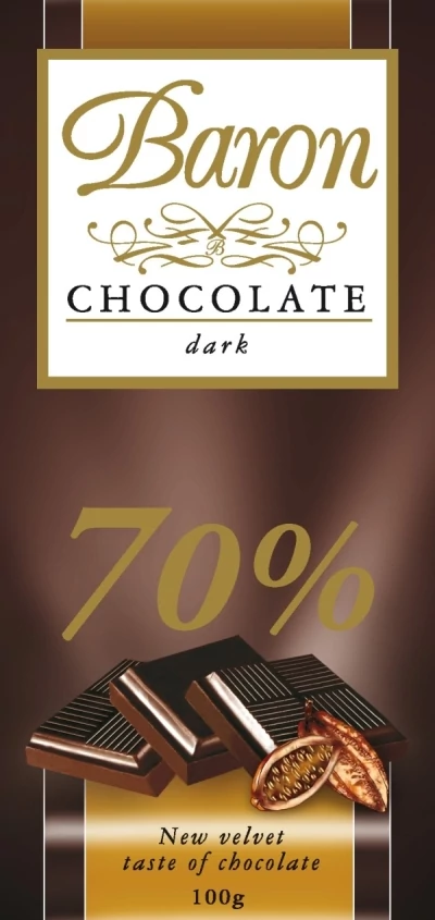 A Baron Étcsokoládé 70% egy kiváló minőségű étcsokoládé, amely legalább 70% kakaótartalommal rendelkezik. Intenzív, gazdag ízvilága a csokoládé kedvelőinek nyújt különleges élményt.