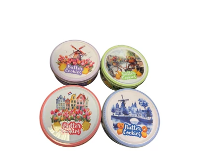 Vajkeksz válogatás díszdobozban, holland mintás kivitelben. Különböző formájú, ropogós, édes vajkekszek egy elegáns fémdobozban.