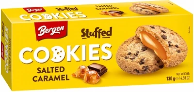 Bergen 130g – Sós karamellel töltött, tejcsokoládé darabos keksz