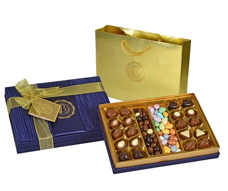 Bolci 18 féle vegyes praliné ét, tej és fehércsokoládéban, exclusive egyedi szatén borítású díszdobozban