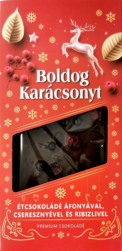 Boldog Karácsonyt 100G Prémium Táblás Étcsokoládé Áfonyával Cseresznyével és Ribizlivel