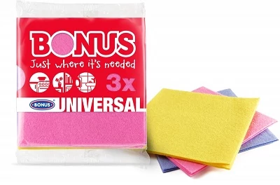 A Bonus+ UNI kendő 3 darabos kiszerelésben tökéletes választás mindennapi háztartási takarításhoz. Különféle felületeken használható – például konyhapultokon, csempén, fürdőszobában vagy bútorokon. Puha, hajlékony, jó nedvszívó képességgel rendelkező kendő, amely hatékonyan távolítja el a port és a szennyeződéseket.