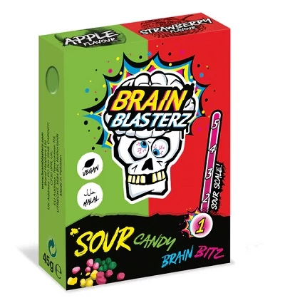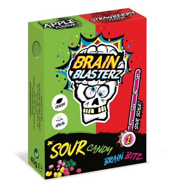 Fedezd fel a savanyú édesség új szintjét a Brain Blasters Bitz cukorkával! Intenzíven savanyú külső réteg és gyümölcsös, zöld alma–eper ízű belső. Kis, ropogós darabok formájában – tökéletes nassolásra és ízbombák robbantására!