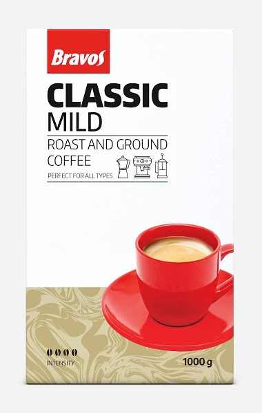 Kíméletes pörkölésű, klasszikus ízvilágú őrölt kávé. Nincs jellemzett allergén — tiszta kávétermék.Bravos Classic Mild Őrölt Kávé 1000 g