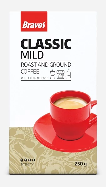 Kíméletes pörkölésű, finom és harmonikus ízvilágú őrölt kávé – ideális reggelihez, espressohoz vagy latte-mókához. Nincs jellemzett allergén – tiszta kávétermék, nem tartalmaz hozzáadott adalékot vagy allergént. Tiszta kávé, szinte minden makronutrienstől mentes. Bravos Classic Mild Őrölt, Pörkölt Kávé 250 g