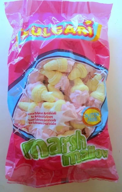 Összetevők: cukor, glükóz-fruktóz szirup, zselatin, kukoricakeményítő, stabilizátor (gumiarábikum), aromaanyagok (vanília, eper, citrom), színezékek (E120, E100), savanyúságot szabályozó anyag (citromsav), olajbevonó anyag (karnaubaviasz). Allergén: tejfehérje nyomokban előfordulhat.