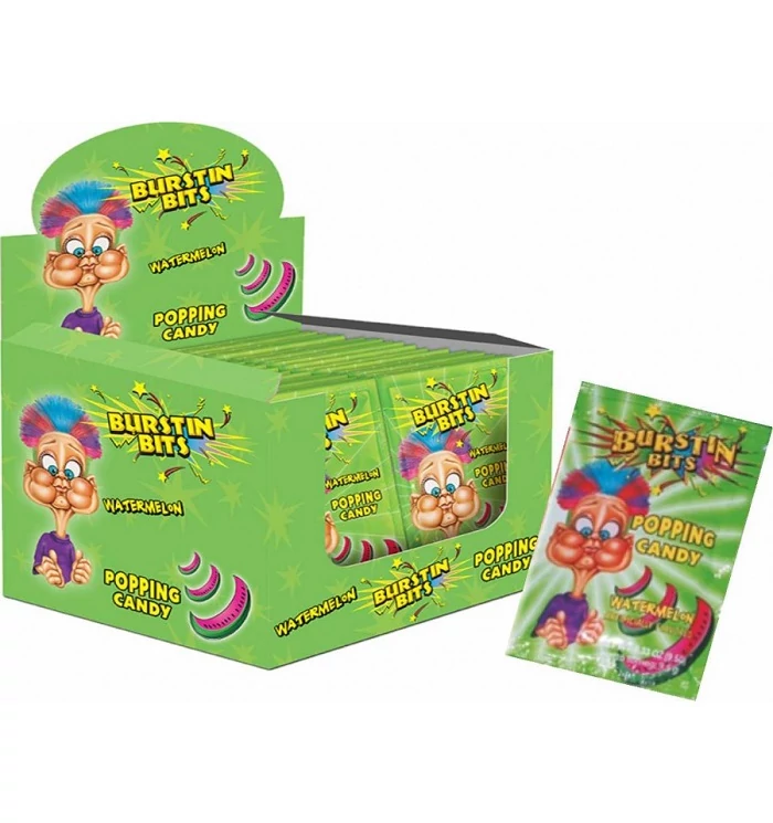 A Burstin Bits Popping Candy Watermelon egy frissítő görögdinnye ízű pattogó cukorka, amely vidám, recsegő élményt nyújt a szájban.