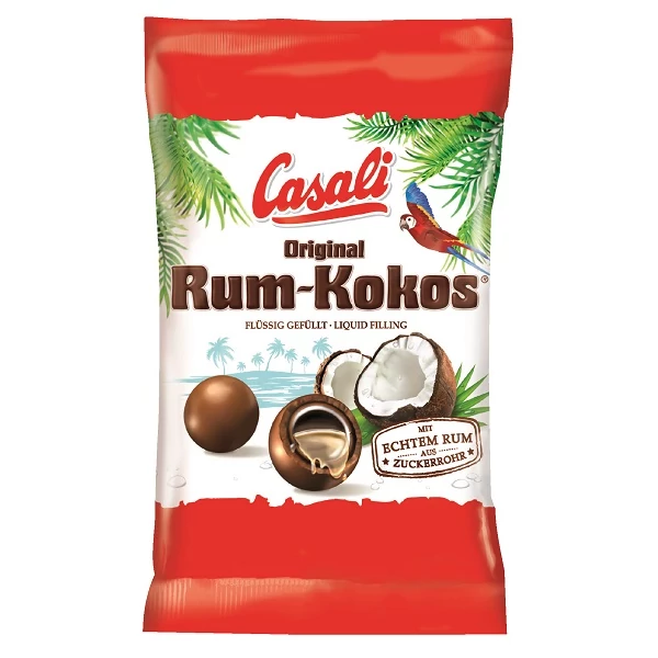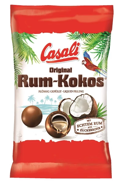 Rumos-kókuszos drazsé alkohollal töltve (10%), tejcsokoládéval (59%) és étcsokoládéval (9%) bevonva