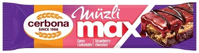 Finom eper és csokoládé ízű müzliszelet, ideális snack vagy gyors energiaforrás a nap bármely szakában.