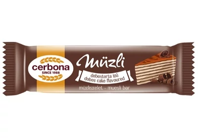 Finom dobostorta ízű müzliszelet, ideális nassolnivaló vagy gyors energiaforrás a nap bármely szakában.