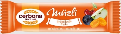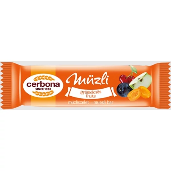 A Cerbona Gyümölcsös müzliszeletet többfajta gabonapehely, méz és gyümölcsdarabok teszik igazán ellenállhatatlanná. Szilva, meggy, sárgabarack, alma - minden ízt megtalálsz benne. Különös gondossággal olyan alapanyagokból állítottuk össze, hogy a szervezetet értékes élelmi rostokkal lássa el.