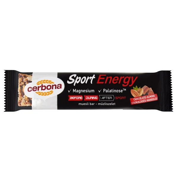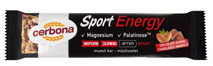 Glükózszirup; Lapított zabpehely; Extrudált gabonapehely (teljes kiőrlésű búzadara, rizsliszt, zsírszegény kakaópor, emulgeálószer: zsírsavak mono- és digliceridjei, étkezési só); Izomaltulóz* (Palatinose™); Csokoládé darabkák 6,6% (cukor, kakaómassza, zsírszegény kakaópor, kakaóvaj, emulgeálószer: szójalecitinek); Szeletelt mandula 6,6%; Kakaóbab töret; Növényi zsír (pálma); Nedvesítőszer: szorbit; Emulgeálószer: szójalecitinek; Magnézium-karbonát; Aromák; *Az izomaltulóz glükóz és fruktóz forrás.