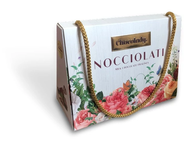Tejcsokoládé praliné mogyorókrémmel és mogyoró darabokkal, egyedi Női táska díszdobozban