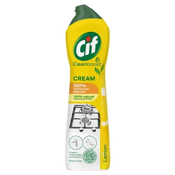 A Cif Folyékony Súroló Citrom hatékony tisztítószer, amely könnyedén eltávolítja a makacs szennyeződéseket, vízkőlerakódásokat és zsírt a konyhai és fürdőszobai felületekről. Finom citromillatot hagy maga után, amely frissességet kölcsönöz a takarítás után.