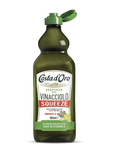 A Costa d'Oro szőlőmagolaj praktikus squeeze (nyomós) flakonban kapható, így könnyen adagolható főzéshez és sütéshez. Világos színű, semleges ízű olaj, amely ideális salátákhoz, grillezéshez, húsokhoz, halakhoz és zöldségekhez. Magas hőstabilitása miatt sütéshez is kiváló. Gazdag telítetlen zsírsavakban és természetes antioxidánsokban.