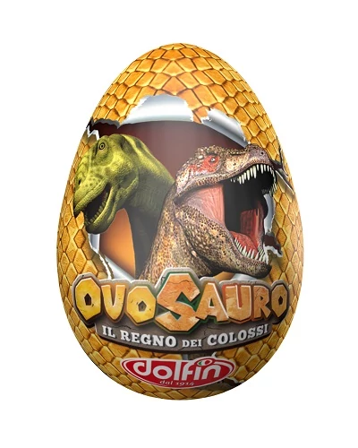 Lenyűgöző, extra nagy Ovosauro dinoszaurusz-motívumokkal díszített tejcsokoládé tojás, belsejében apró Ovosauro figura meglepetéssel. Tökéletes ajándék minden kis dinoszaurusz-rajongónak és édességkedvelőnek.