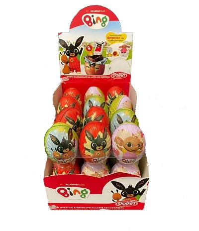 Vidám Bing motívumokkal díszített tejcsokoládé tojás, belsejében apró meglepetéssel. Tökéletes kis ajándék gyerekeknek és rajongóknak.