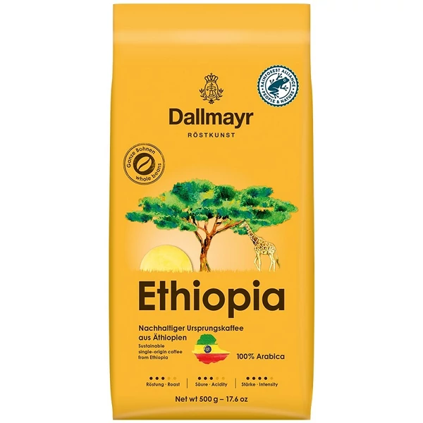 Kiváló minőségű, fenntartható forrásból származó 100 % Arabica szemes kávé Etiópiából. Kíméletes közepes pörkölésének köszönhetően aromákban gazdag – vad gyógynövényes-rozmaringos jegyekkel, lemongrass-citrus esszenciával és egy leheletnyi sötét csokoládéval. Használható szemes kávéfőzőkben, automata gépekben, eszpresszóban, de kiváló filteres vagy French press kávénak is – szépen kibontakozik az aromája. Legjobb ízért tárolja száraz, hűvös helyen, közvetlen napfénytől védve – optimális hőmérséklet ~18–22 °C. Felbontás után ajánlott légmentes csomagban tartani. Nem tartalmaz allergéneket. 100 % kávé, keresztszennyeződés nem jellemző.Dallmayr Ethiopia Szemes Kávé 500 g