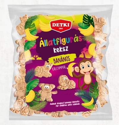 A Detki állatfigurás banános háztartási keksz egy finom, ropogós édesség, amely különleges banános ízével és kedves állatfiguráival varázsolja el a kicsiket és nagyokat egyaránt. Ideális nassolnivaló a nap bármely szakában.