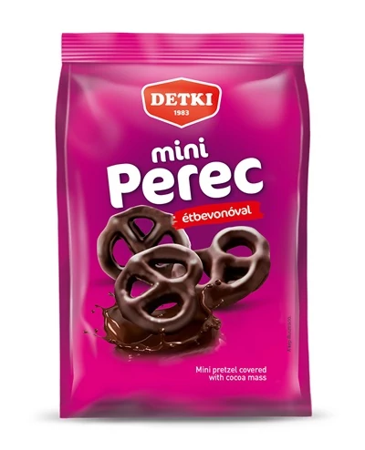A Detki Mini Perec étbevonóval omlós, édes keksz teljesen kakaós étbevonómasszába mártva. Ropogós állag, klasszikus kakaós bevonat – tökéletes nassolnivaló.