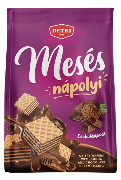 A Detki Mesés Nápolyi Kakaós-Csokoládés Krémmel ropogós ostyalapokból áll, amelyeket lágy kakaós-csokoládés krémréteg tölt meg. Klasszikus, harmonikus ízvilága tökéletes választás a csokoládé szerelmeseinek, akár önálló nassolnivalónak, akár kávé vagy tea mellé.
