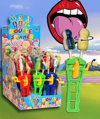 A Double Spinner Gyümölcsízű Nyalóka (30 g) kettős forgórészű, élénk színű és gyümölcsös ízű nyalóka – vízszintes és függőleges forgással is játszó formatervezésben, szórakoztató nassolnivaló gyerekeknek és felnőtteknek egyaránt.