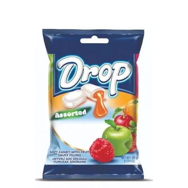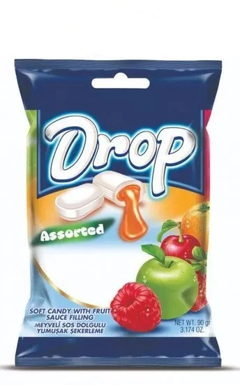 A Drop Assorted 90G egy puha rágó cukorka válogatás, melynek belsejében gyümölcsös töltelék található. Többféle gyümölcsös ízben elérhető, mint például narancs, eper és alma. .