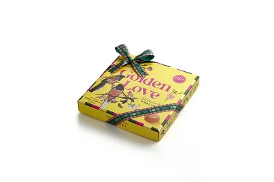 Válogatás exkluzív pralinékból elegáns sárga díszdobozban: fehér csokoládé citromos-vaníliás krémmel és tejcsokoládé karamellás-mogyorós praliné töltelékkel – luxus élmény minden alkalomra.