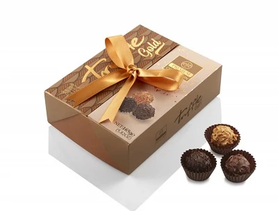 Elegáns arany díszdobozban kínált prémium trüffelválogatás – selymes ganache-töltelékekkel, tej-, ét- és fehércsokoládé bevonattal. Luxus élmény minden alkalomra.