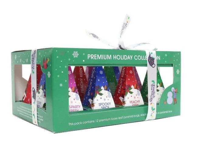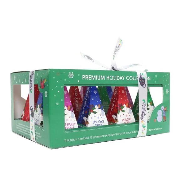 Ünnepi hangulatú, bio minőségű zöld tea válogatás piramis filtertasakokban, zöld hóemberes díszítésű csomagolásban. Ez a válogatás gazdag, frissítő zöld tea ízeket kínál, tökéletes választás a téli időszakban, ajándéknak vagy saját teázáshoz.