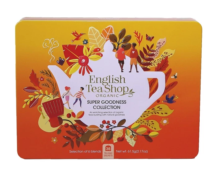 Prémium minőségű, kézzel válogatott bio és Fairtrade wellness teaválogatás fémdobozban mesterséges íz- és adalékanyagok nélkül, ellenőrzött ökológiai gazdálkodásból.