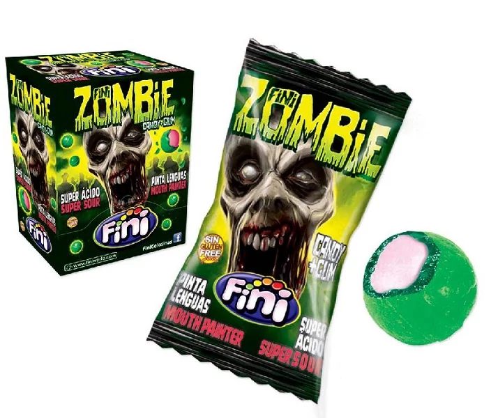 A Fini Zombie Candy + Gum (200×5 g, 10198) hátborzongató formájú, vegyes gyümölcsös ízű rágógumi és cukorka kombó – puha gumi és ropogós cukor textúra, élénk aroma és zombis grafikák minden egyes darabban.