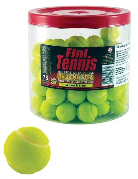 A Fini Mega Chicle Tennis Ball (18 g, 10080) óriás teniszlabda formájú rágógumi – puha, rugalmas állag és élénk vegyes gyümölcsös aromák (eper, citrom, narancs, alma) minden egyes darabban, hosszú, lágy rágási élményért.