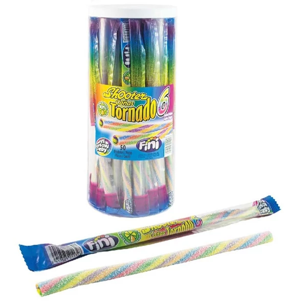 Fini, szívószál formájú gyümölcsízű gumicukor savanyú porral panírozva, darabonként 26 gramm.