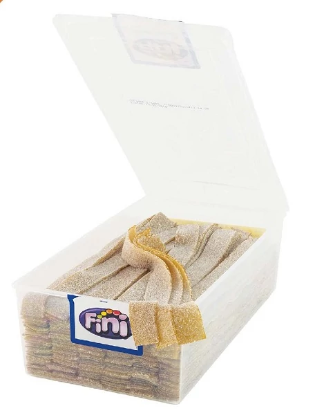 A Fini Szíj Savanyú Cola (1,7 kg, 10055) egyedi savanykás kólás ízű gumiszíj válogatás – hosszú, rugalmas szeletek, intenzív kólaaroma és élénk savanykás utóíz minden egyes darabban.