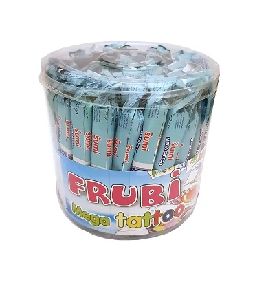 A Frubi Mega Tatto egy kiszerelésű, olvadós állagú rágógumi, amely különleges tetováló mintákat tartalmaz.