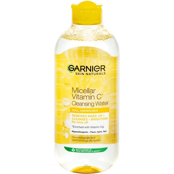 A Garnier Vitamin C Micellás Víz micellás technológiával és C-vitamin-származékkal (Ascorbyl Glucoside) hatékonyan távolítja el a sminket, szennyeződéseket és olajat a bőrről egyetlen lépésben. Egyidejűleg segíti a bőr ragyogásának fokozását, bőre tisztább, friss és üdébb megjelenésű marad :contentReference[oaicite:1]{index=1}.