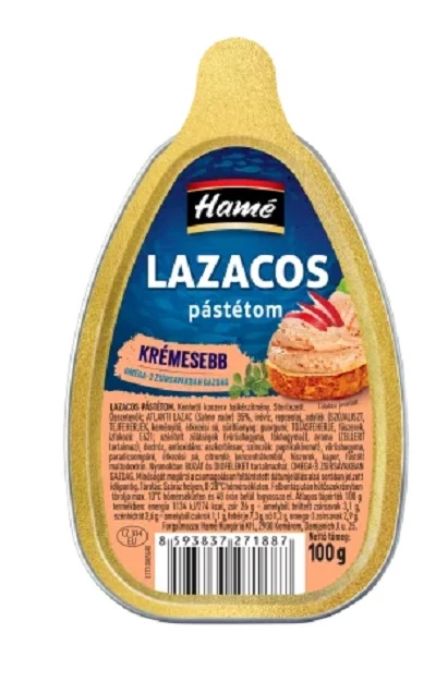Omega-3 zsírsavakban gazdag. Lazacos pástétom. Halkészítmény, konzerv. Hőkezelt.
