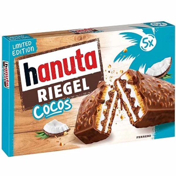 A Hanuta Riegel Cocos egy finom mogyorós töltelékkel és kókuszos ízzel gazdagított ostyarúd, melyet lágy csokoládé von be. Praktikus 5 darabos kiszerelésben ideális nassolnivaló bármilyen alkalomra.