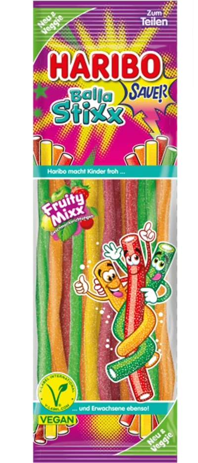 A Haribo Balla Stixx Fruity Mixx egy színes és gyümölcsös pálcikás édességválogatás. A puha állagú, rágós töltött gumicukrok különféle gyümölcsízekkel (például eper, málna, citrom, narancs) csábítanak, és kiváló választást jelentenek nassoláshoz, bulikra vagy akár ajándéknak is.
