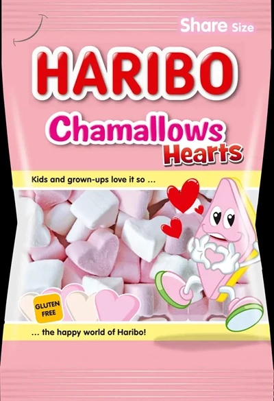 Szív alakú, puha habcukorka gyümölcsös ízesítéssel.