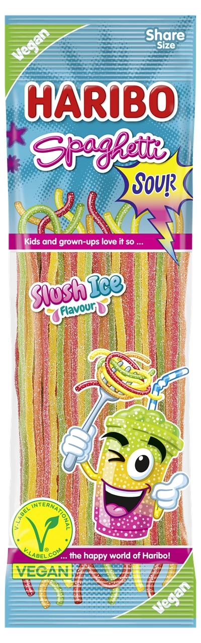 Savanykás, spaghetti alakú gyümölcsgumi a frissítő Slush-Ice ízvilág jegyében.