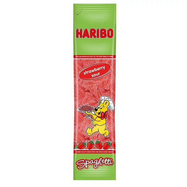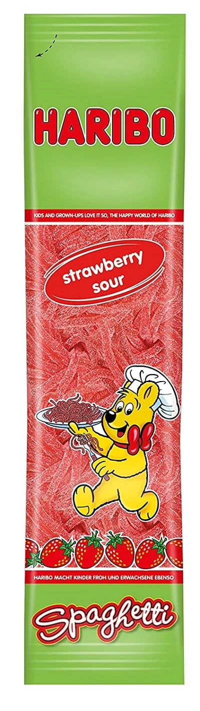 Savanykás eper ízű gumispagetti, amely frissítő és intenzív aromájával varázsolja el a savanyú édességek kedvelőit. Egyedi formájával és zamatos ízével ideális nassolnivaló minden korosztálynak.