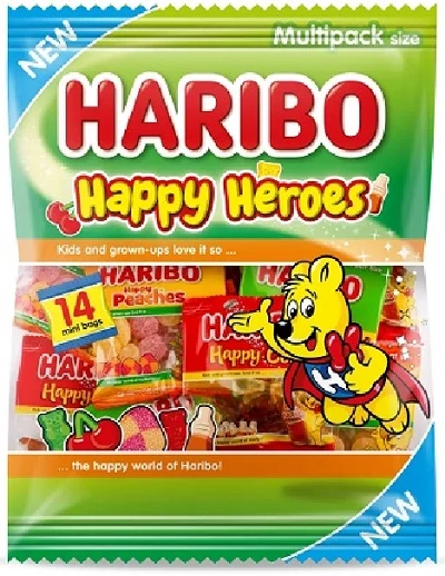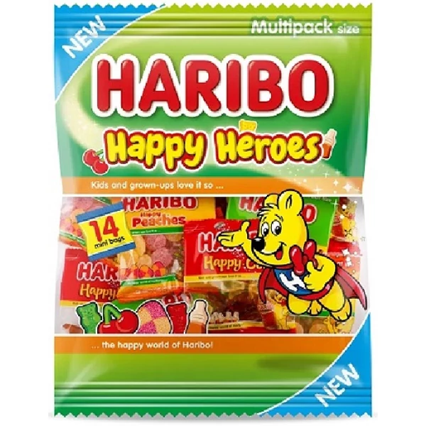 Összetevők: Glükózszirup, cukor, napraforgóolaj, zselatin, dextróz, gyümölcslevek sűrítményből (alma, eper, málna, narancs, citrom, ananász), étkezési savak (citromsav, fumársav), gyümölcs- és növényi sűrítmények (spirulina, sáfrányos szeklice, alma, bodzabogyó, narancs, fekete ribizli, kivi, citrom, arónia, mangó, passiógyümölcs, szőlő, édesburgonya, sárgarépa, retek, hibiszkusz), aromák, bodzabogyó-kivonat, karamellszirup, fényezőanyagok (fehér- és sárga méhviasz). Allergének: Nyomokban tej és búza előfordulhat. Tárold száraz, hűvös helyen, közvetlen napfénytől és nedvességtől védve. Haribo Happy Heroes 350 g – Vegyes gyümölcs- és kólaízű gumicukorka