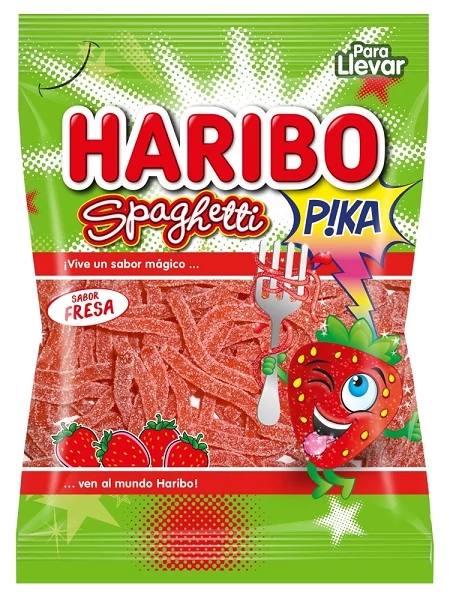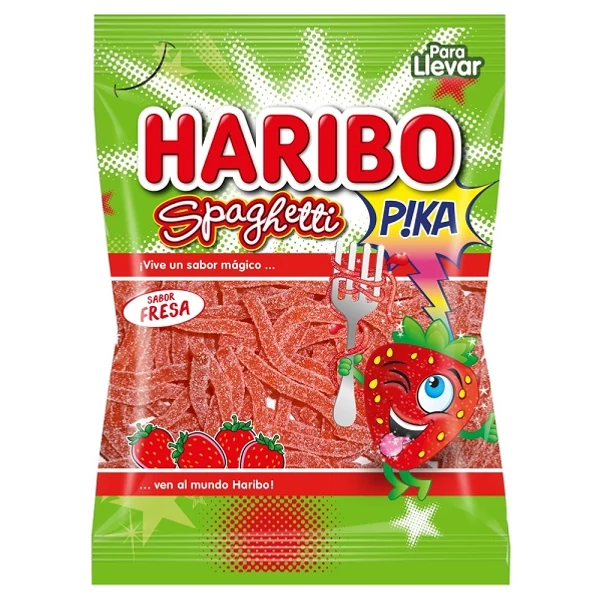 Összetevők: Cukor, glükózszirup, kukoricakeményítő, nedvesítőszer: szorbitszirup, búzaliszt, étkezési savak: citromsav, almasav, savanyúságot szabályozó anyag: nátrium-hidrogén-malát, emulgeálószer: zsírsavak mono- és digliceridjei, aroma, gyümölcs- és növényi sűrítmények: fekete ribizli, bodzabogyó, arónia, szőlő, sáfrányos szeklice, narancs, citrom, bodzabogyó-kivonat. Allergének: Nyomokban tejet tartalmazhat. Tárold száraz, hűvös helyen, közvetlen napfénytől és nedvességtől védve. Haribo Epres Spagetti 75 g – Édes és savanykás gumicukor szálak
