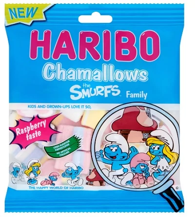 Tartalmaz: szója (lecitin). Glutént nem tartalmaz.Haribo 90G Chamallows Hupikék Törpikék