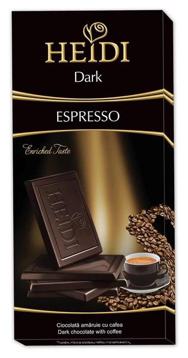 Intenzív étcsokoládé finom espresso aromával. A Heidi Étcsokoládé Espresso erőteljes kakaókaraktert és gazdag kávéaromát kínál egy kompakt, 37 g-os kiszerelésben.