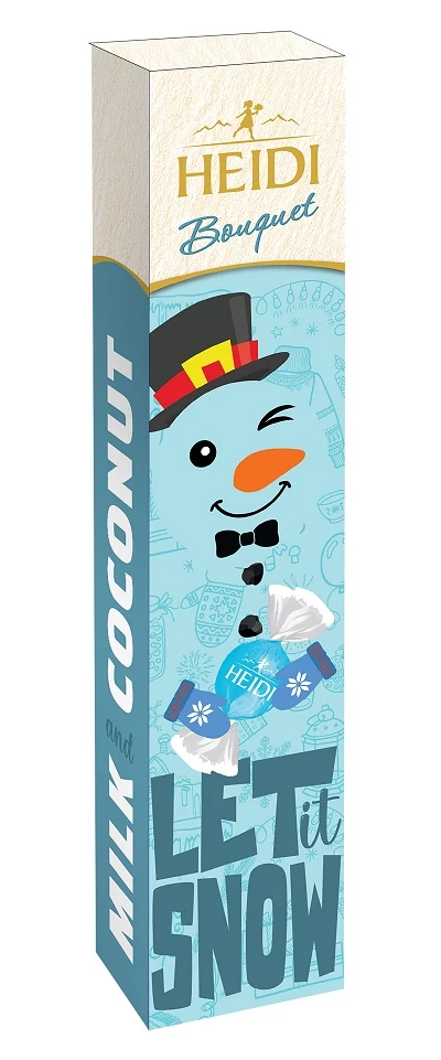 Ünnepi tejcsokoládé pralinék lágy kókuszkrémes töltelékkel, hóember mintázattal díszítve. A Heidi Bouquet Snowman Kókuszkrémes finom kókusz aromája és krémes állaga meleg, téli hangulatot varázsol minden falatba.